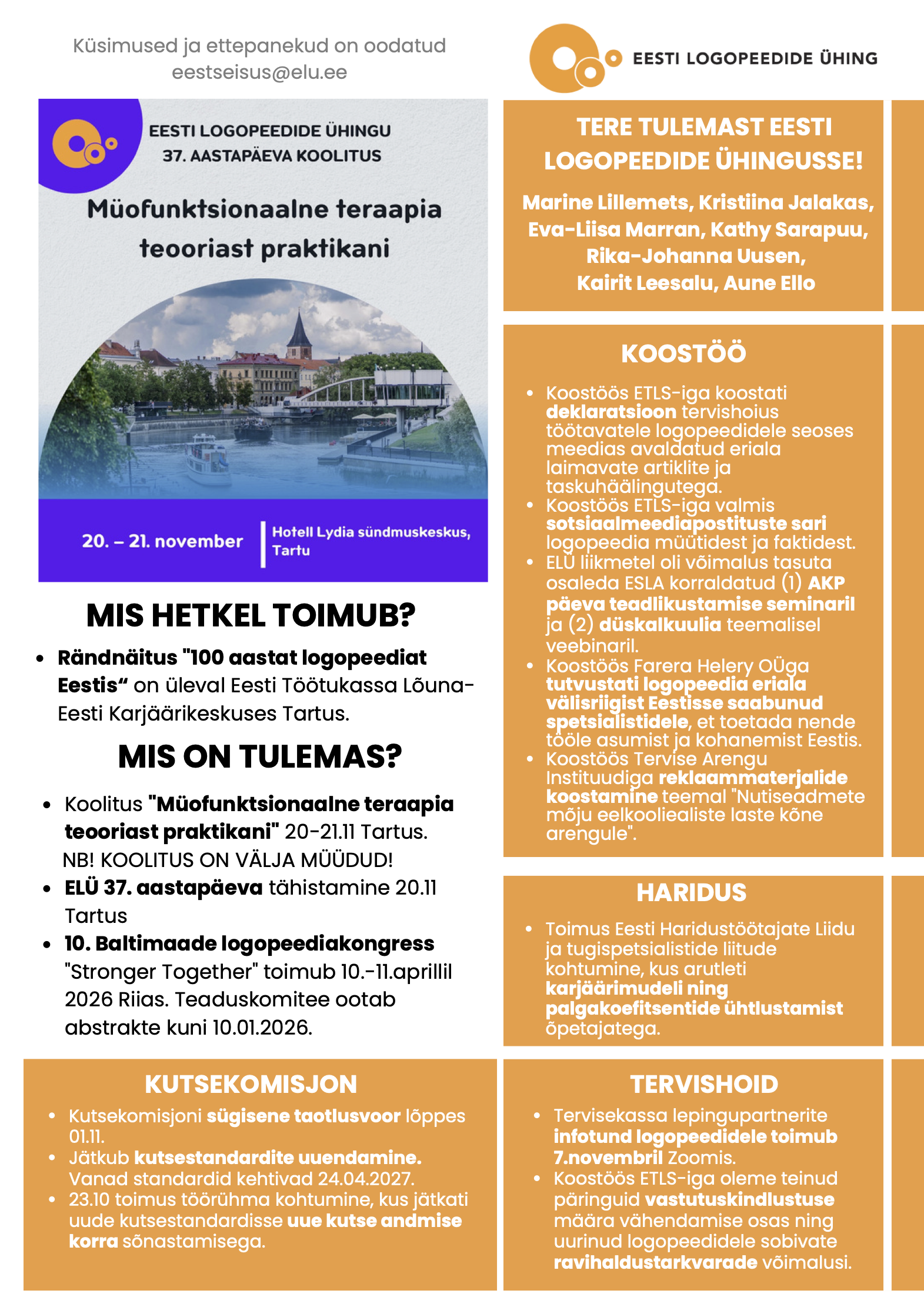 - ELÜ 37. aastapäeva tähistamine 20. novembril TartusHea Eesti Logopeedide Ühingu liige! Tuletame meelde, et juba 20. novembril jagame välja järgmised kolleegipreemiad kolmes kategoorias: Tingimused kandidaadi esitamiseks: Saada oma… Read more: ELÜ 37. aastapäeva tähistamine 20. novembril Tartus