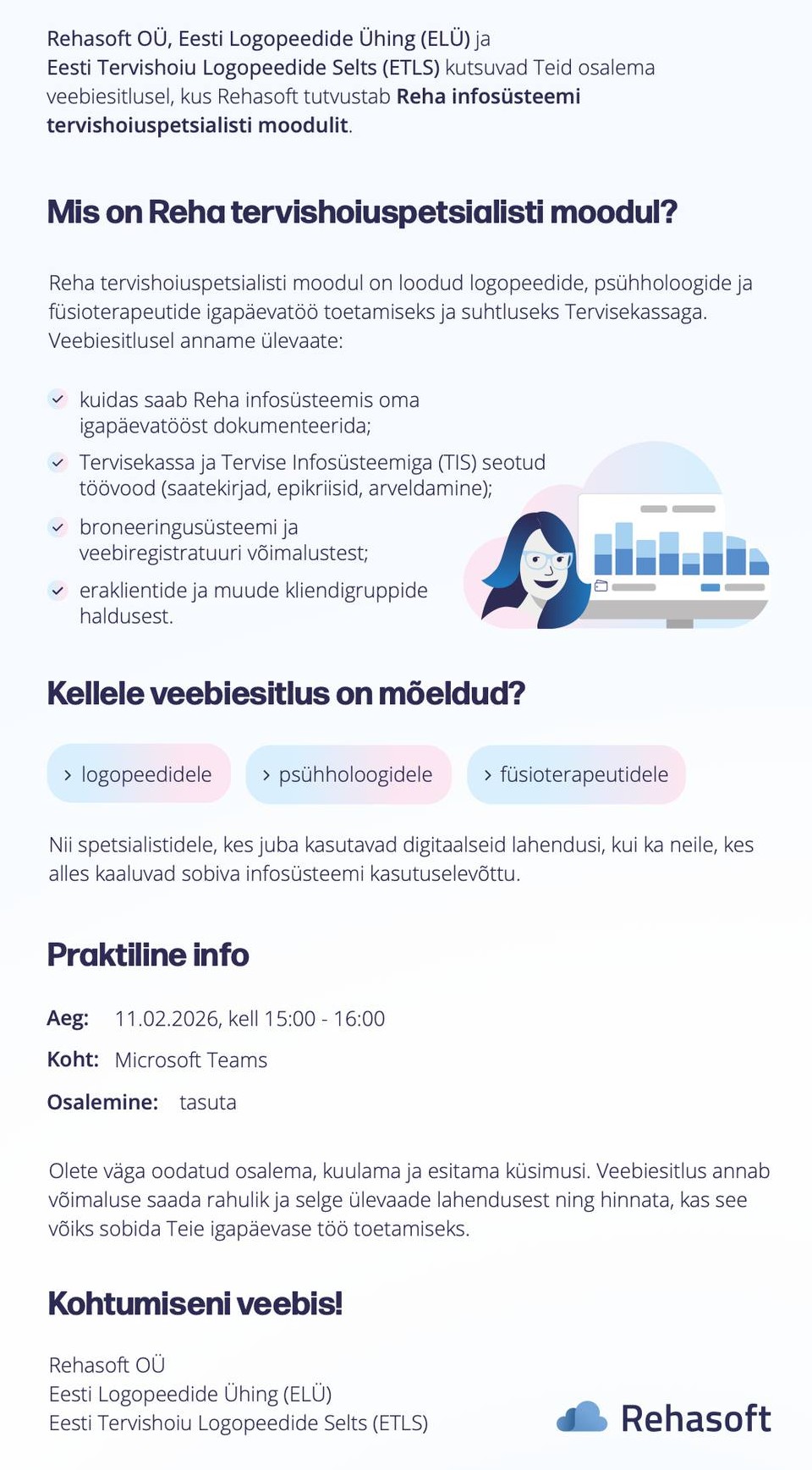 Kutsume teid osalema veebiesitlusel, kus Rehasoft OÜ tutvustab Reha infosüsteemi tervishoiuspetsialisti moodulit.