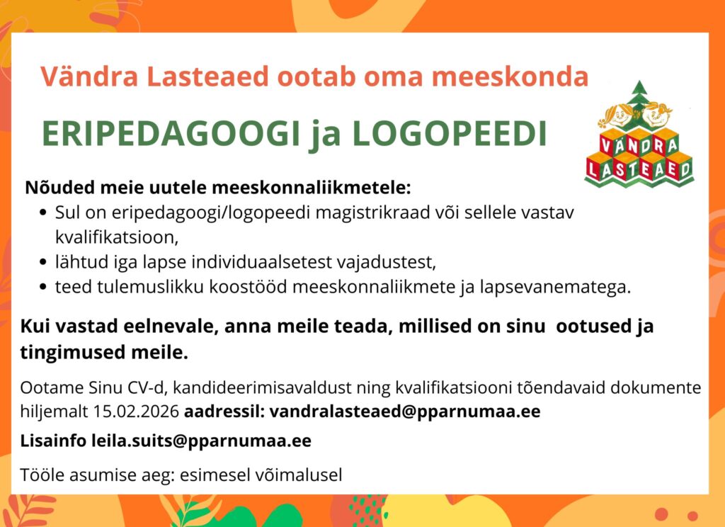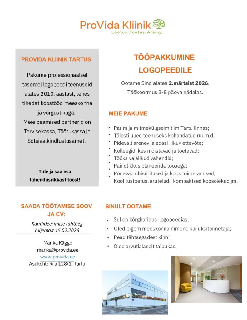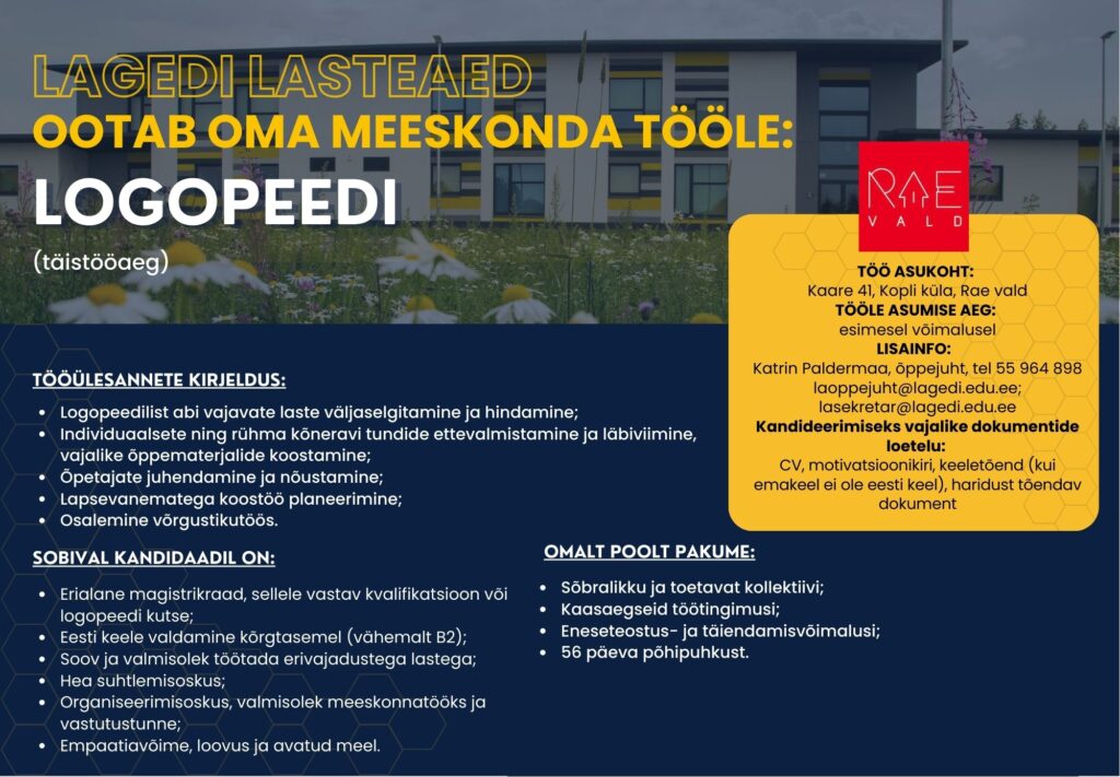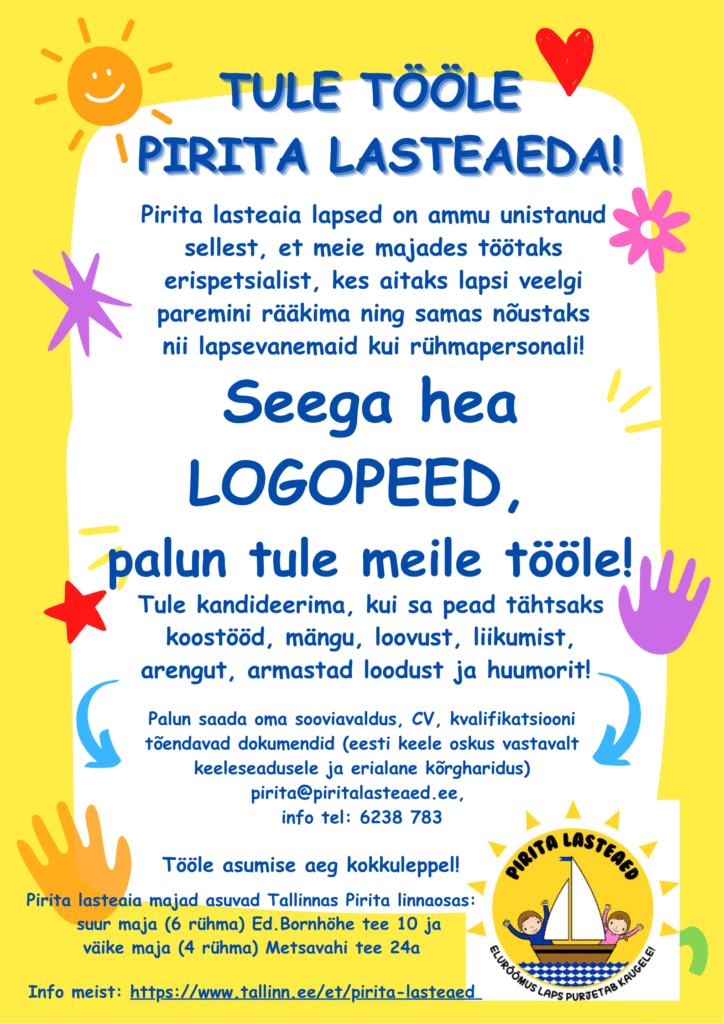 Tallinna Männiku Lasteaed otsib oma meeskonda 0,5-1,0 koormusega logopeedi. Meie uus, aasta tagasi valminud kaunis lasteaed asub Tallinna rohepealinnas Nõmmel, Kraavi 4. Meil on suurepärased töötingimused, võrratud kolleegid ja väga vahvad lapsed.