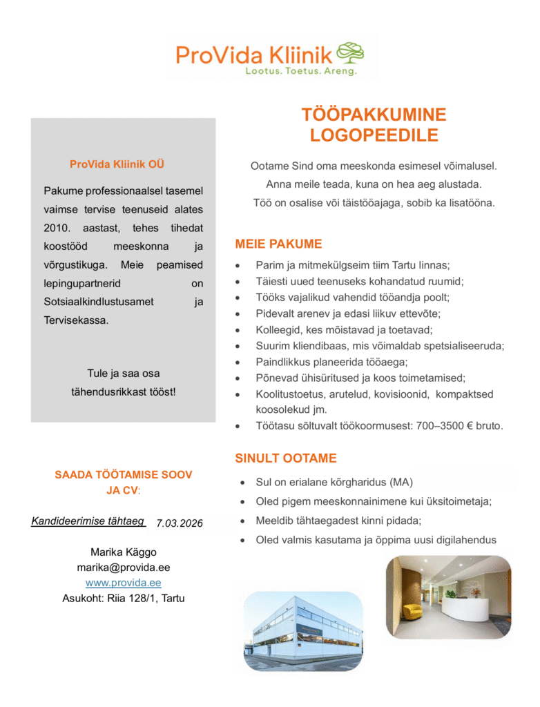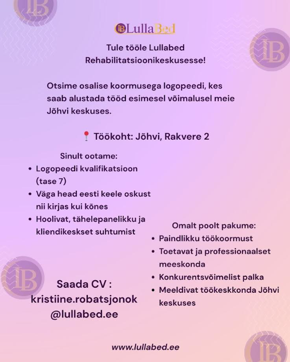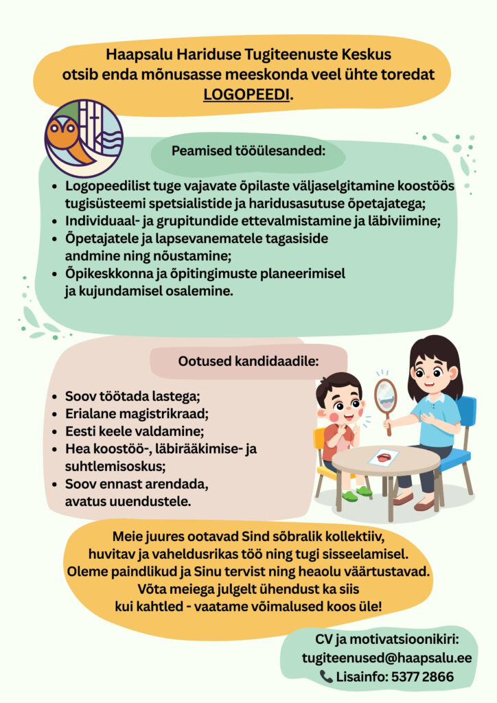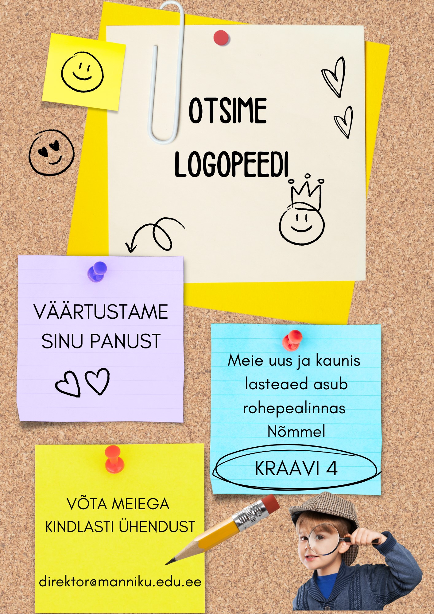 Tallinna Männiku Lasteaed otsib oma meeskonda 0,5-1,0 koormusega logopeedi. Meie uus, aasta tagasi valminud kaunis lasteaed asub Tallinna rohepealinnas Nõmmel, Kraavi 4. Meil on suurepärased töötingimused, võrratud kolleegid ja väga vahvad lapsed.