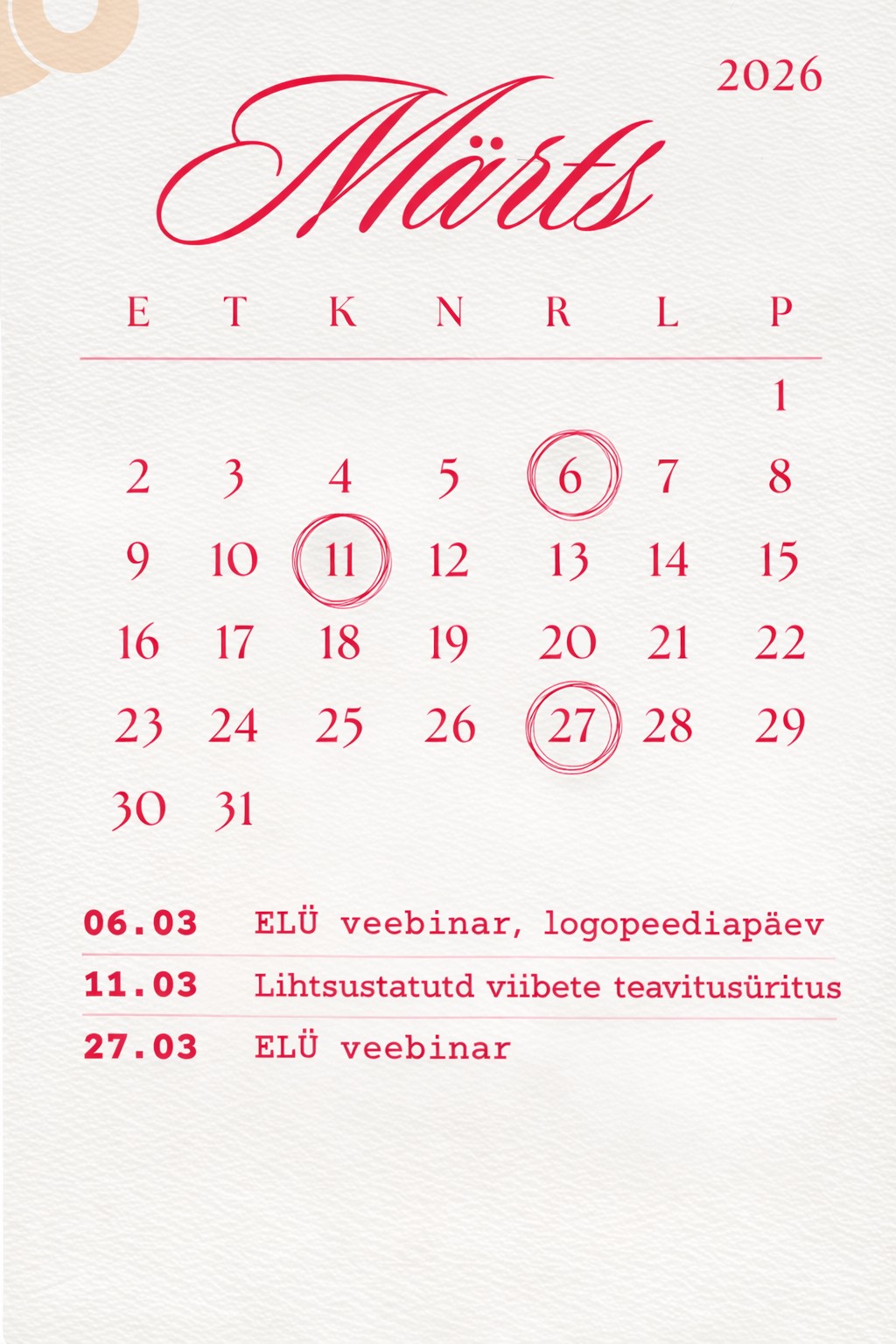 - Tasuta veebirakenduse “Lihtsustatud viiped – kommunikatsioonipuudega inimestele mõeldud õppevara“ teavitusüritus “Suhtlemine on inimese põhiõigus” 11.03.2026Haridus- ja Teadusministeerium ja Eesti Logopeedide Ühing kutsuvad osalema veebirakenduse “Lihtsustatud viiped – kommunikatsioonipuudega inimestele mõeldud õppevara“ teavitusüritusel “Suhtlemine on… Read more: Tasuta veebirakenduse “Lihtsustatud viiped – kommunikatsioonipuudega inimestele mõeldud õppevara“ teavitusüritus “Suhtlemine on inimese põhiõigus” 11.03.2026